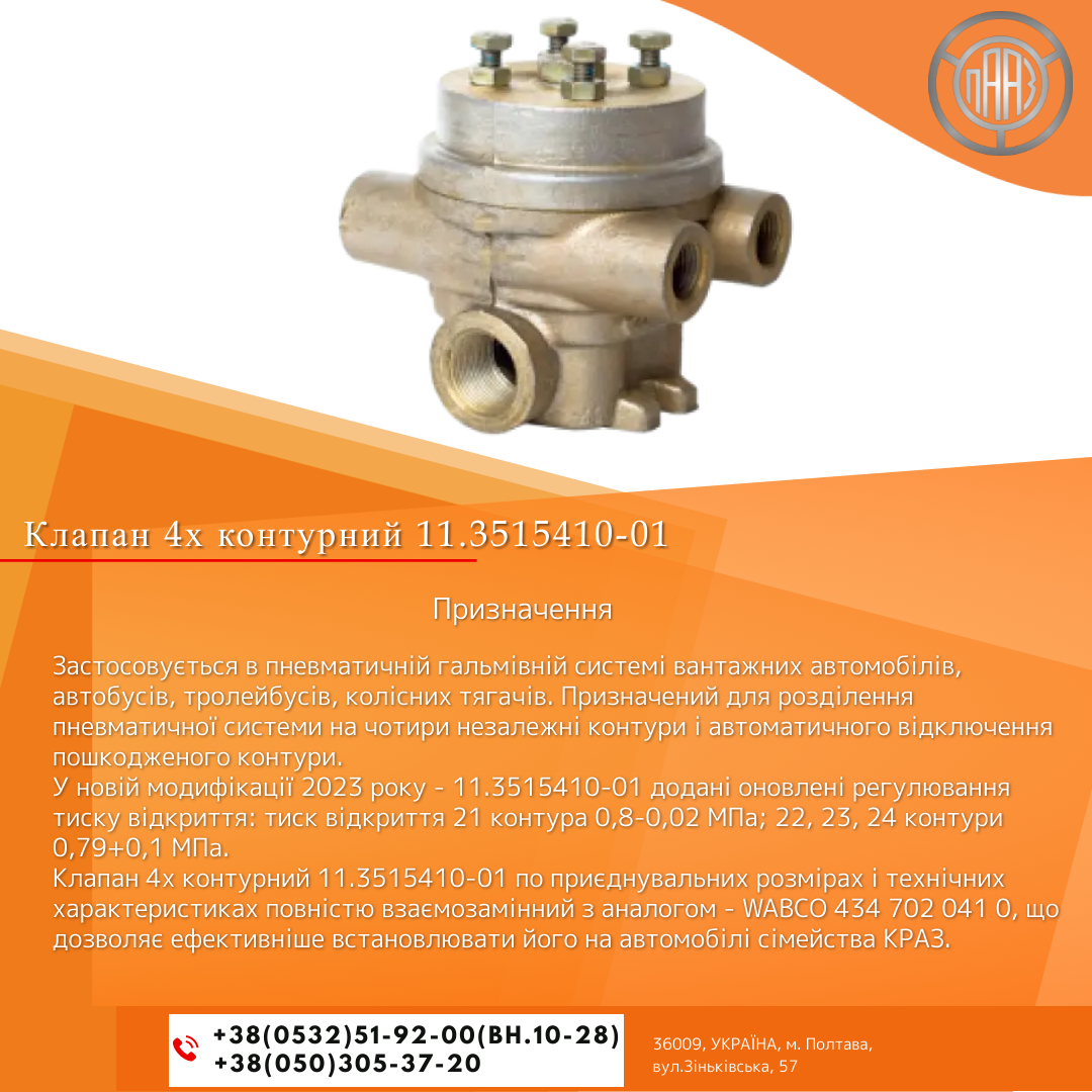 Клапан 4х контурный 11.3515410-01 по присоединительным размерам и техническим характеристикам полностью взаимозаменяем с аналогом – WABCO 434 702 041 0, что позволяет более эффективно устанавливать его на автомобили семейства КрАЗ.